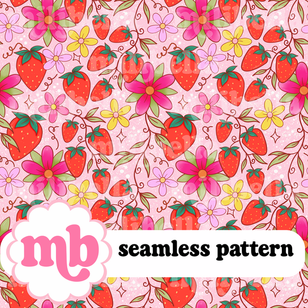 Strawberry Vines and Flowers Pink Seamless Pattern