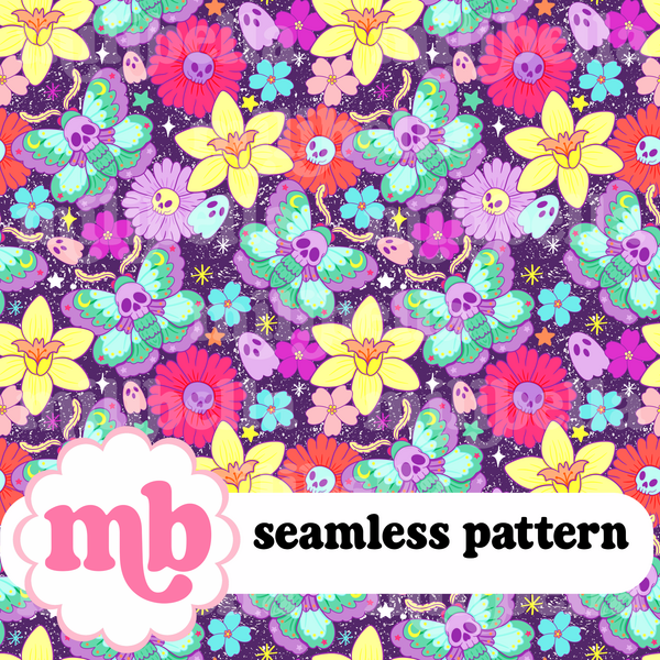 Neon Halloween Skull Moth Flowers Seamless Pattern
