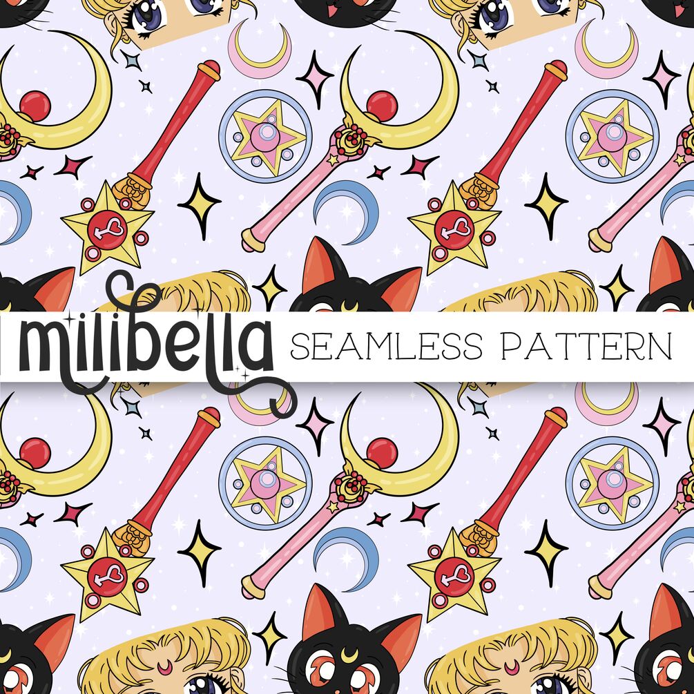 Lavender background with stars. Cat, Sailor face, wands, crescent moons and stars